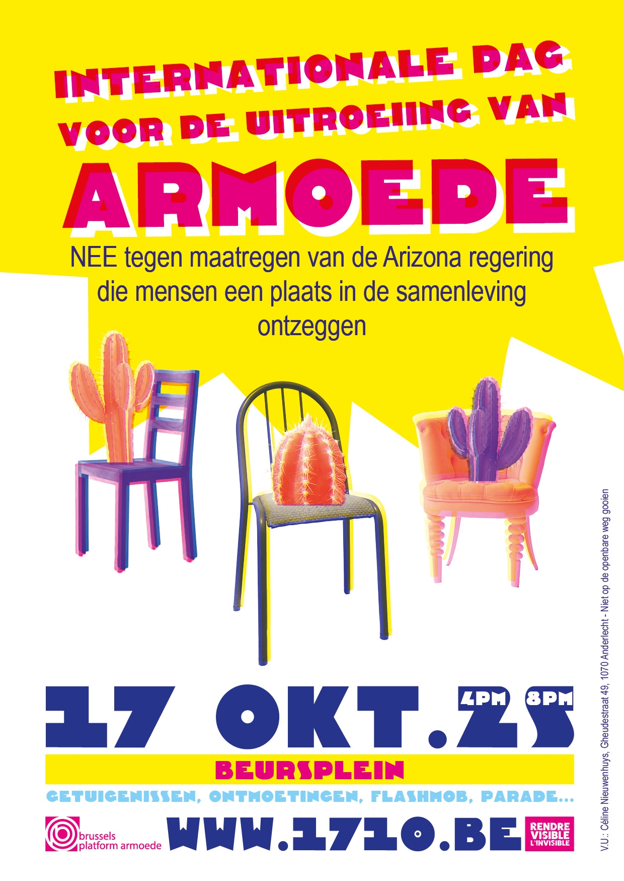 Dit jaar kozen het front Rendre Visible l’Invisible en het Brussels Platform Armoede de antisociale maatregelen van de federale regering en hun impact op mensen in armoede als thema: verstrenging van de pensioenregeling, beperking van de van de werkloosheid in de tijd, verhoogde druk op mensen in langdurige arbeidsongeschiktheid en vluchtelingen,… In een steeds moeilijker wordende sociaal-economische context tast Arizona de rechten van de meest kwetsbare mensen aan, terwijl de belangen van de meest bevoorrechten worden beschermd.